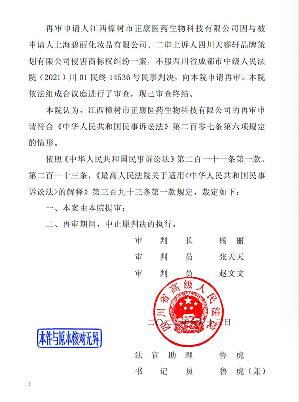 6月13日,四川高院決定對江西樟樹市正康醫(yī)藥生物科技有限公司與被申請人上海碧麗化妝品有限公司案申請再審案進行提審,并裁定,再審期間中止原判決的執(zhí)行。