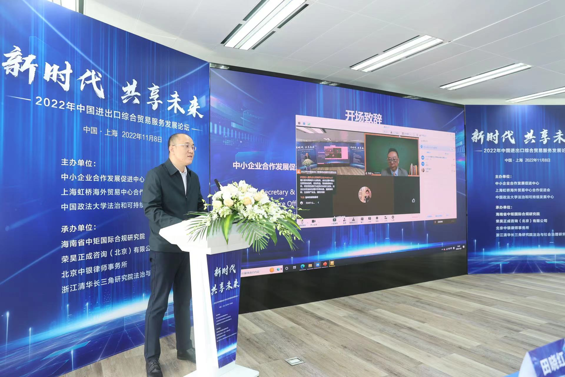 2022年11月8日,由中小企業(yè)合作發(fā)展促進(jìn)中心、上海虹橋海外貿(mào)易中心合作促進(jìn)會(huì)、中國政法大學(xué)法治與可持續(xù)發(fā)展中心共同主辦的“2022年中國進(jìn)出口綜合貿(mào)易服務(wù)發(fā)展論壇”在上海虹橋海外貿(mào)易中心隆重舉行,政府領(lǐng)導(dǎo)、專家學(xué)者、企業(yè)代表共同探討綜合貿(mào)易服務(wù)變化及貿(mào)易合規(guī)挑戰(zhàn)。