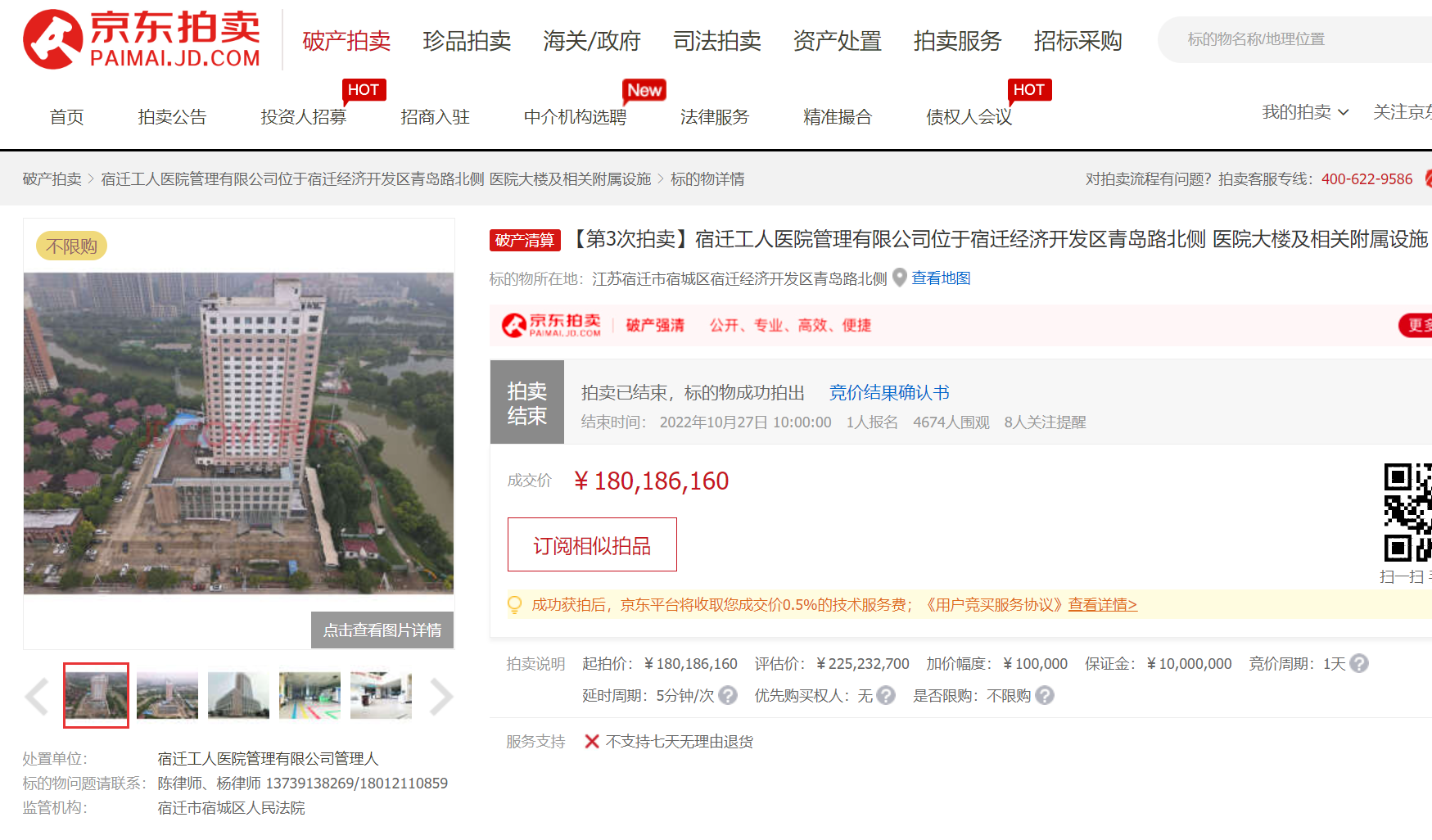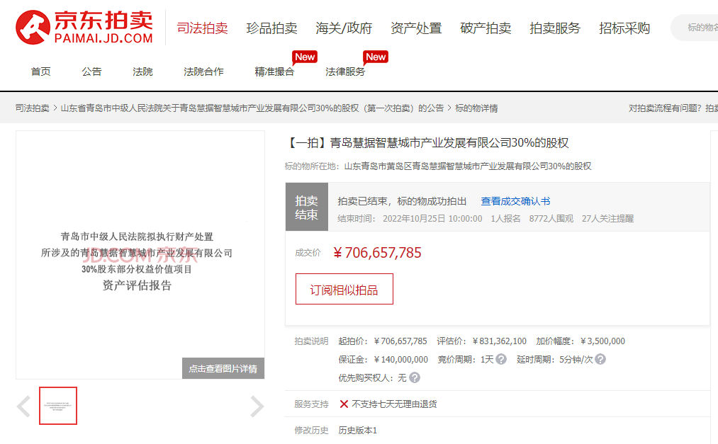 青島慧據(jù)智慧城市產(chǎn)業(yè)發(fā)展有限公司30%的股權(quán)以7.07億元成交,成為本屆“標(biāo)王”。北京四中院處置的北京市海淀區(qū)西三環(huán)北路“光耀東方”項(xiàng)目,評(píng)估價(jià)超10.7億元,于11月11日以6.02億元成交。北京市朝陽(yáng)區(qū)景林路的一處房產(chǎn),在近萬(wàn)人的圍觀下,經(jīng)過(guò)55次競(jìng)價(jià)后,以1.58億成交,成為京東11.11期間成交額最高的單體住宅項(xiàng)目。許昌晨鳴紙業(yè)股份有限公司名下機(jī)器設(shè)備一宗,最終以2.6億元成功拍出,溢價(jià)1.6億元,溢價(jià)率達(dá)160%。
