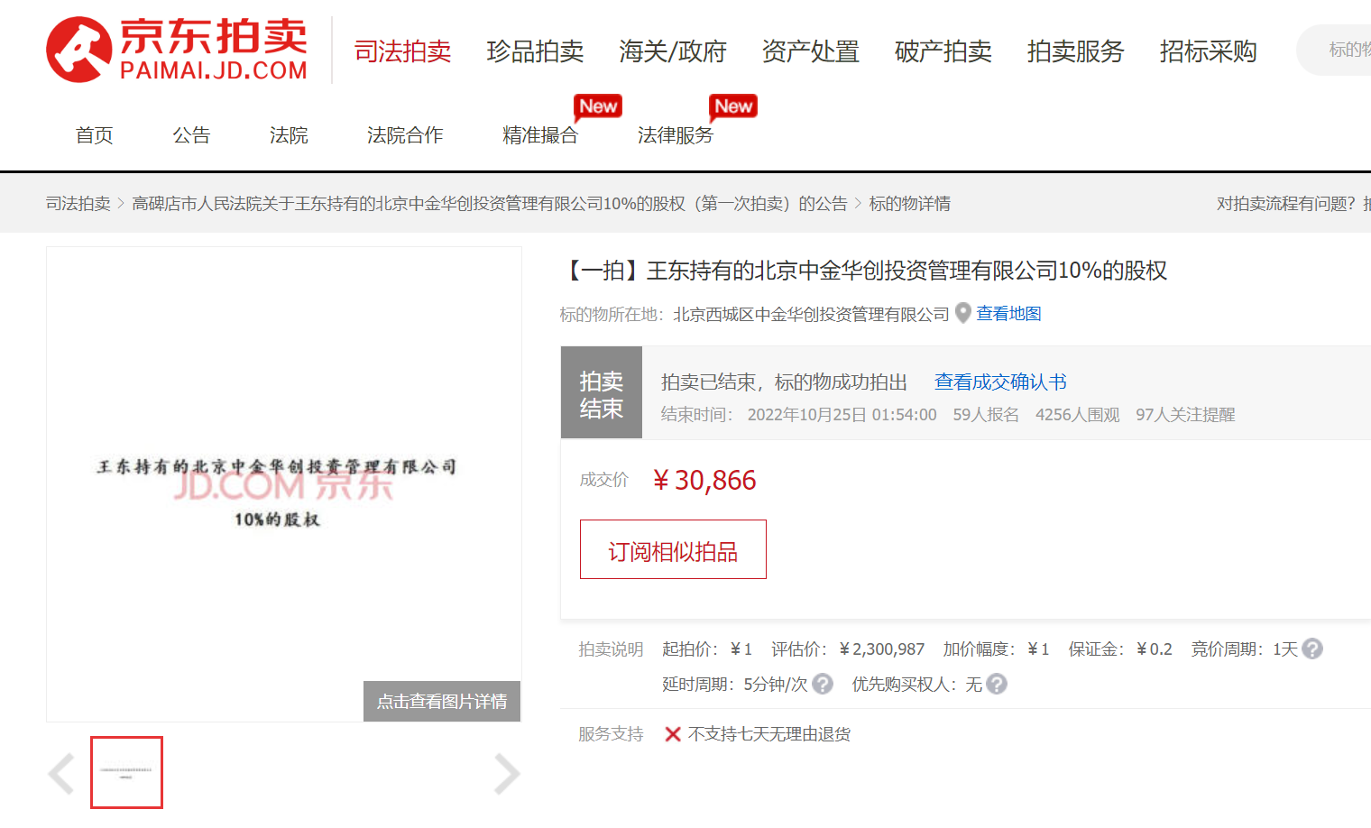 實(shí)在的價(jià)格充分激發(fā)了競(jìng)買人對(duì)資產(chǎn)處置標(biāo)的的熱情。某自然人持有的北京中金華創(chuàng)投資管理有限公司10%的股權(quán),以1元價(jià)格起拍,共有59人報(bào)名,經(jīng)過(guò)3202次競(jìng)價(jià),最終以3.09萬(wàn)元成交,此次拍賣也創(chuàng)造了京東拍賣11.11期間競(jìng)拍次數(shù)最多的紀(jì)錄。