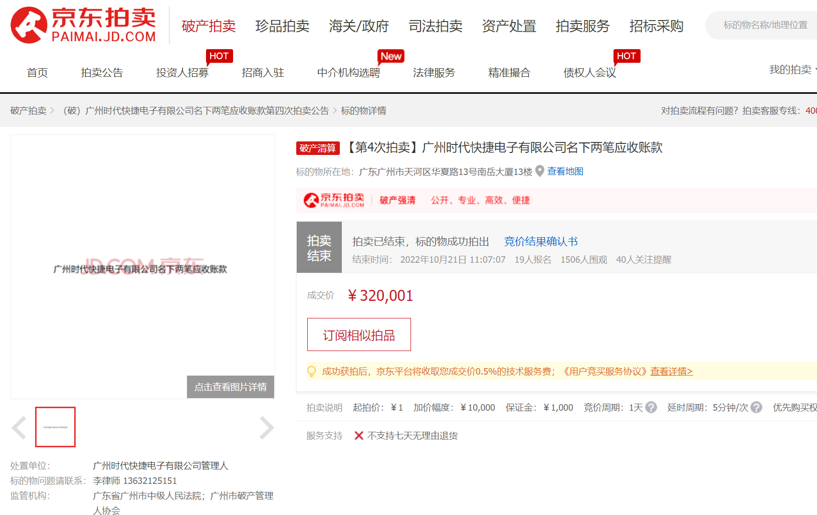 低起拍價(jià)對(duì)消費(fèi)者的吸引力十足,在濃厚的競(jìng)價(jià)氛圍中,創(chuàng)造了超高溢價(jià)率。1元起拍的廣州時(shí)代快捷電子有限公司名下兩筆應(yīng)收賬款,于10月21日以320001元成交,溢價(jià)倍數(shù)高達(dá)320000。