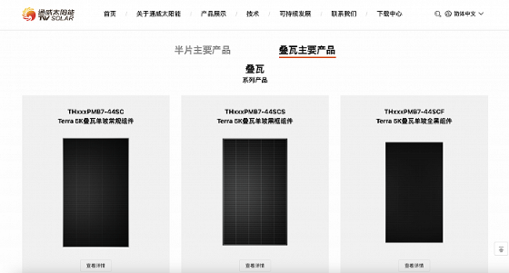 界面新聞注意到,通威太陽(yáng)能官網(wǎng)顯示了七款疊瓦主要產(chǎn)品。在去年年報(bào)中,通威股份在組件部分提到,海外市場(chǎng)重點(diǎn)聚焦歐洲、亞太、南美等終端市場(chǎng),利用各版型疊瓦、半片產(chǎn)品“矩陣”,滿足海外客戶對(duì)高效組件的差異化需求。