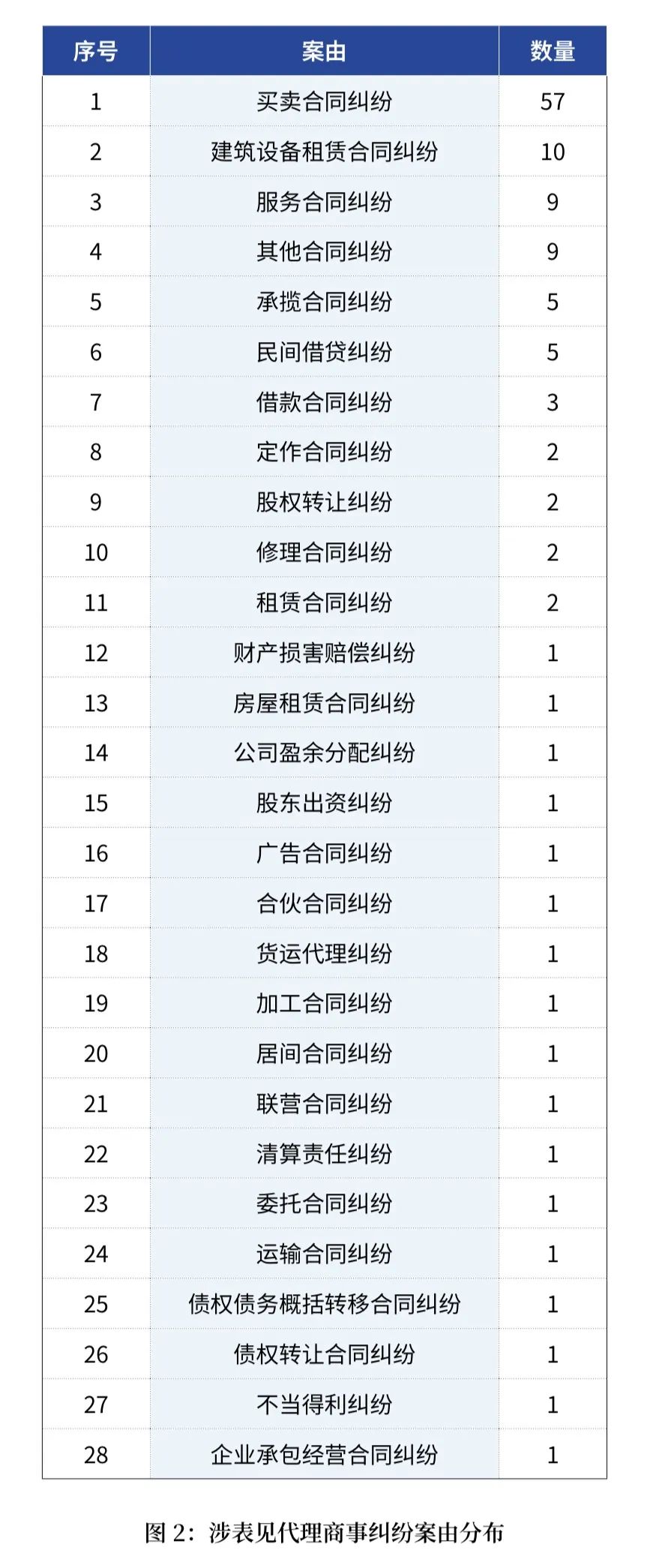 2019年至2022年審結(jié)的涉表見(jiàn)代理商事糾紛案件共涉及28個(gè)案由,其中買賣合同糾紛案件為57件,占比46.34%,接近總數(shù)量的一半;建筑設(shè)備租賃合同糾紛案件為10件,占比8.13%;服務(wù)合同糾紛案件、其他合同糾紛案件各為9件,分別占比7.32%,此四類合同,分別占結(jié)案數(shù)的前三位。(如圖2)