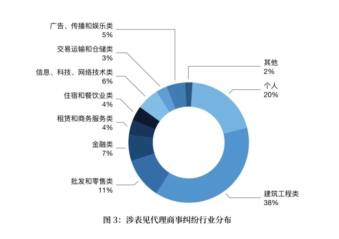 123件涉表見(jiàn)代理商事糾紛案件中,涉訴主體共有327名,其中公司為260家,占79.51%,個(gè)人為67人,占20.49%。在260家公司中,根據(jù)行業(yè)分類,建筑工程類有125家,批發(fā)和零售類有36家,金融類有22家,信息、科技、網(wǎng)絡(luò)技術(shù)類有19家,住宿和餐飲業(yè)有22家,信息傳輸、信息技術(shù)服務(wù)業(yè)有18家,租賃和商務(wù)服務(wù)有14家,建筑業(yè)有12家,交通運(yùn)輸、倉(cāng)儲(chǔ)業(yè)有9家,娛樂(lè)業(yè)有6家,其他行業(yè)有6家。(如圖3)