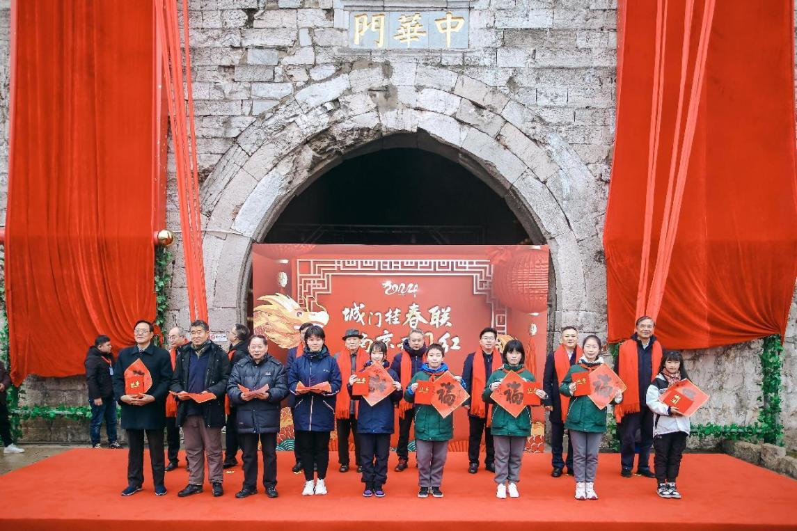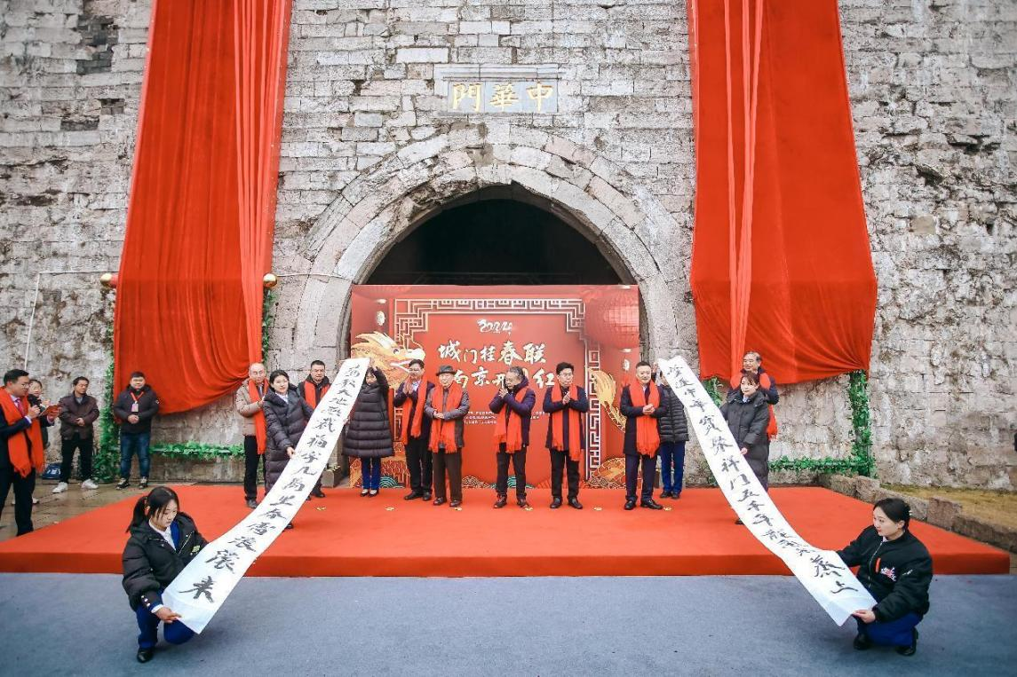 1月21日上午,由中共南京市委宣傳部、南京市文化和旅游局、新華報業(yè)傳媒集團、中國銀行江蘇省分行聯(lián)合主辦的2024年“城門掛春聯(lián),南京開門紅”揭聯(lián)儀式在中華門隆重舉行。南京市委常委、宣傳部部長陳勇,新華日報社黨委書記、社長雙傳學,南京市文化和旅游局黨委書記、局長謝國慶,中國銀行江蘇省分行資深業(yè)務經(jīng)理兼南京分行行長陳新宏,新華日報社黨委委員、副總編輯鄭澤云,江蘇省楹聯(lián)研究會會長周游,江蘇省書法家協(xié)會副主席兼秘書長劉燦銘等出席揭聯(lián)儀式。