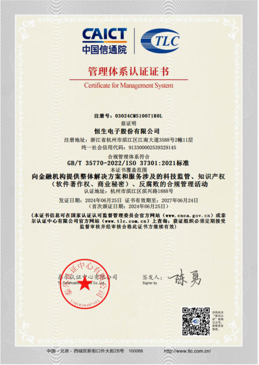 恒生電子股份有限公司的主要業(yè)務(wù)是向金融機(jī)構(gòu)提供整體解決方案和服務(wù),此次認(rèn)證范圍覆蓋了主要業(yè)務(wù)涉及的科技監(jiān)管、軟件著作權(quán)、商業(yè)秘密、反腐敗的合規(guī)管理活動。ISO 37301是國際通用的合規(guī)管理體系認(rèn)證標(biāo)準(zhǔn),規(guī)定了組織建立、運(yùn)行、保持和改進(jìn)合規(guī)管理體系的要求,獲得該認(rèn)證,表明恒生公司具備了該標(biāo)準(zhǔn)所要求的合規(guī)管理水平及能力。
