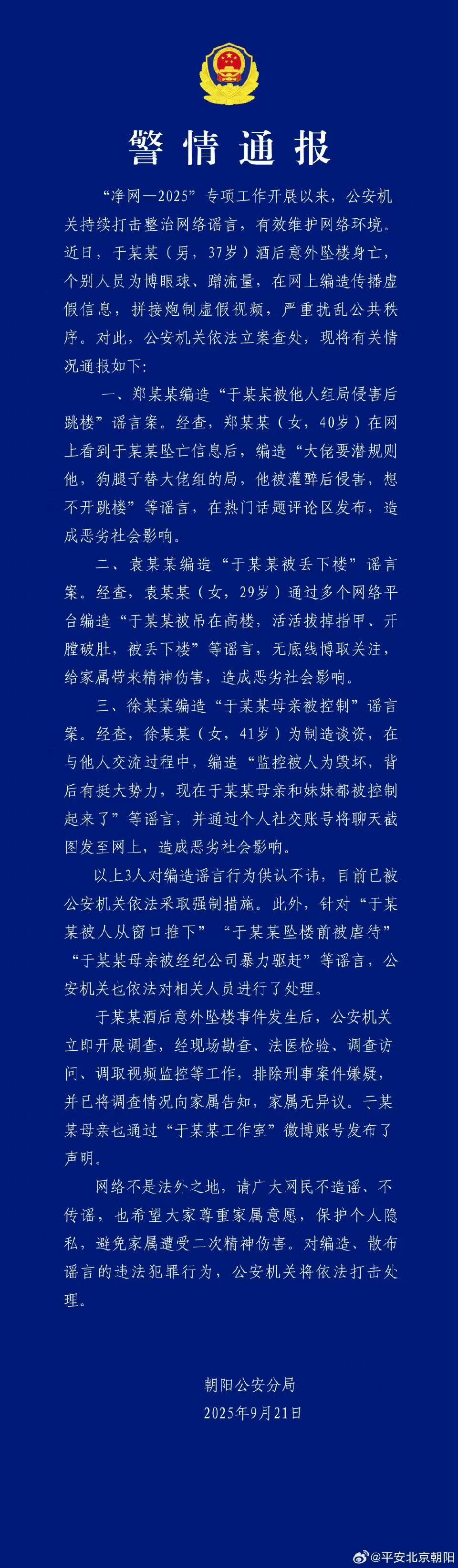 北京市公安局朝陽分局9月21日通報,近日,于某某(男,37歲)酒后意外墜樓身亡,個別人員為博眼球、蹭流量,在網上編造傳播虛假信息,拼接炮制虛假視頻,嚴重擾亂公共秩序。公安機關依法對相關人員立案查處,并通報相關情況。
