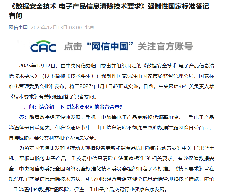 2025年12月2日,由中央網(wǎng)信辦歸口提出并組織制定的《數(shù)據(jù)安全技術(shù) 電子產(chǎn)品信息清除技術(shù)要求》(以下簡(jiǎn)稱《技術(shù)要求》)強(qiáng)制性國(guó)家標(biāo)準(zhǔn)由國(guó)家市場(chǎng)監(jiān)督管理總局、國(guó)家標(biāo)準(zhǔn)化管理委員會(huì)批準(zhǔn)發(fā)布,將于2027年1月1日起正式實(shí)施。日前,中央網(wǎng)信辦有關(guān)負(fù)責(zé)人就《技術(shù)要求》有關(guān)問題回答了記者提問。