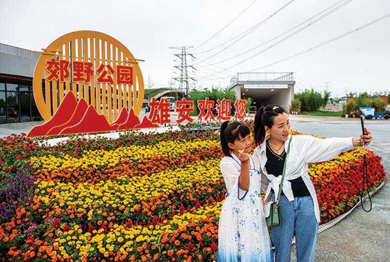 7月18日,游客在雄安郊野公園拍照留念。