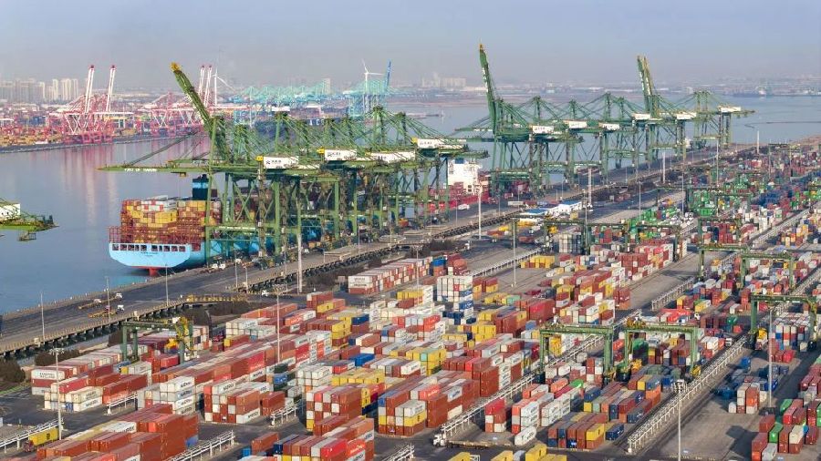 2月2日拍攝的天津港太平洋國際集裝箱碼頭(無人機照片)。新華社記者趙子碩 攝