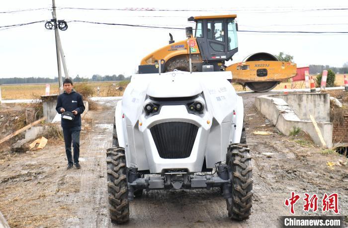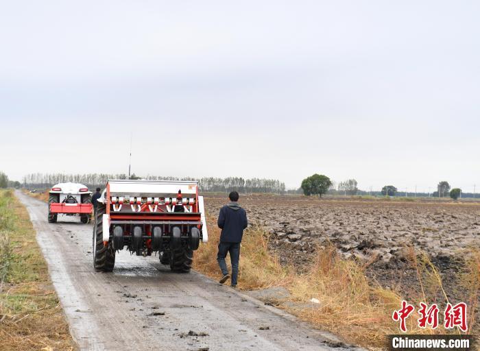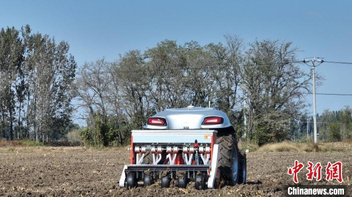 10月22日,河北雄安新區(qū)安新縣端村鎮(zhèn)關(guān)城二村一農(nóng)田內(nèi),“鴻鵠T70”電動智能拖拉機(jī)準(zhǔn)備進(jìn)行秋播作業(yè)。中新社記者 韓冰 攝