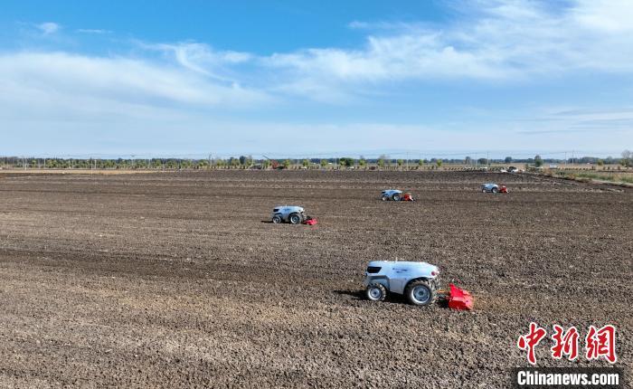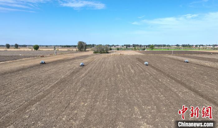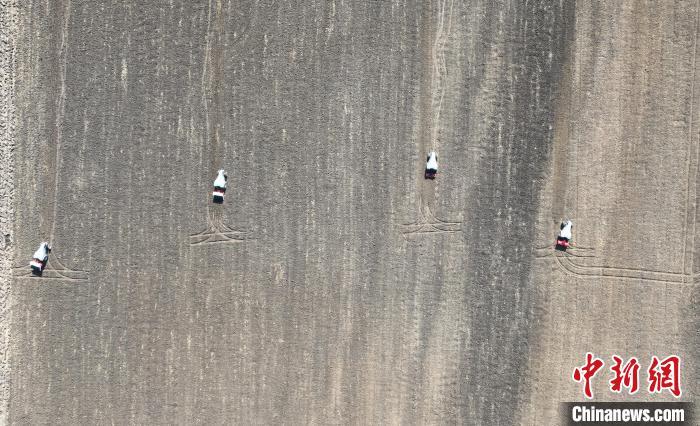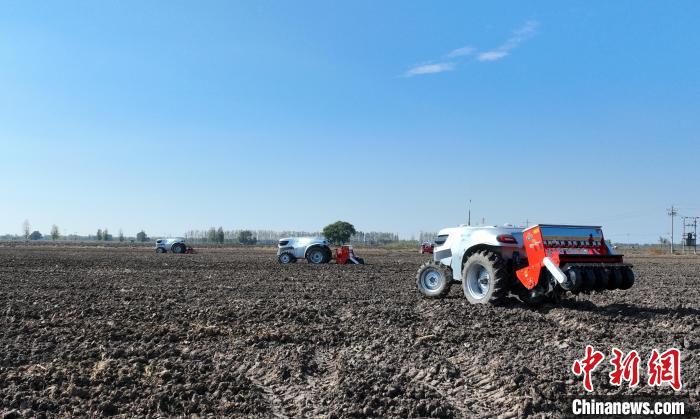 10月22日,河北雄安新區(qū)安新縣端村鎮(zhèn)關(guān)城二村一農(nóng)田內(nèi),幾臺“鴻鵠T70”電動智能拖拉機(jī)正在進(jìn)行秋播作業(yè)。(無人機(jī)照片)中新社記者 韓冰 攝