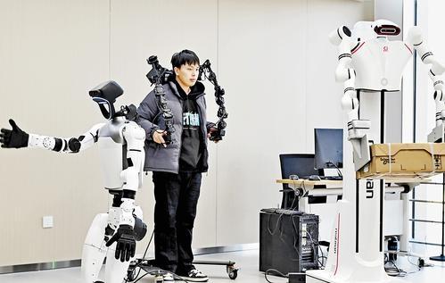 近日,在中國雄安集團數(shù)字城市科技有限公司的具身智能訓(xùn)練場內(nèi),數(shù)據(jù)采集員正對異構(gòu)機器人進行具身智能訓(xùn)練。記者劉光昱 攝