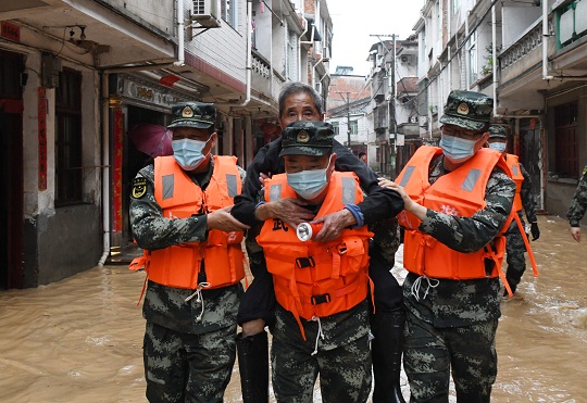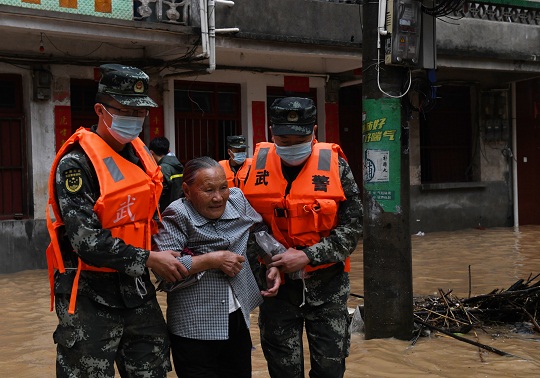圖為武警官兵轉(zhuǎn)移被困老人。