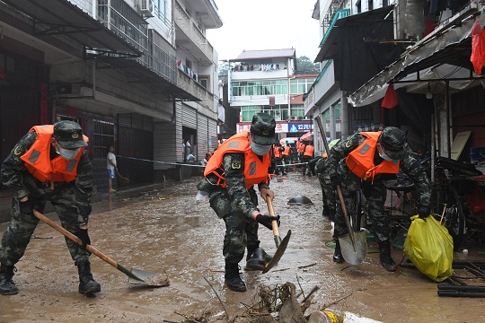 圖為武警官兵為受災(zāi)街道清淤,恢復(fù)生活秩序。