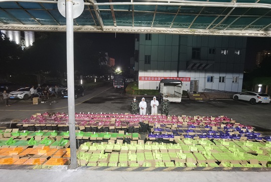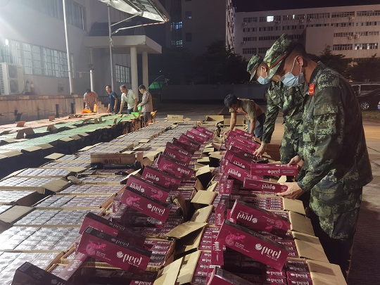 針對臺風“暹芭”剛過境,走私分子可能會心存僥幸利用較低潮位從事走私活動的現(xiàn)實情況,該局科學研判,嚴密部署執(zhí)法力量加強轄區(qū)管控。7月6日晚23時許,在轄區(qū)海域蹲守的海警執(zhí)法員發(fā)現(xiàn)有不明“大飛”蹤跡,經(jīng)過圍追堵截最終將涉嫌走私“大飛”一舉抓獲,現(xiàn)場抓獲涉案嫌疑人兩名,查獲涉嫌走私香煙一批,該船后置5臺“雅馬哈”機頭,總馬力超1000匹。經(jīng)合浦縣疾控中心對上述涉案物品及人員進行消殺、核酸檢測,結果均為陰性。經(jīng)清點,查獲美國“百樂”牌香煙約400件,共計1.9萬余條,總案值約500萬元。目前,該案件正在進一步深挖擴線中。