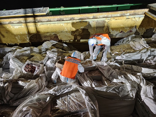 經(jīng)查,該嫌疑船艙內(nèi)滿裝大量白色編制袋貨物一批,經(jīng)開箱查驗(yàn),發(fā)現(xiàn)箱內(nèi)裝有涉嫌走私雪花牛肉、牛黃喉、牛百葉等來源不明凍品,共約200余噸。隨船人員均未能提供船舶證件及該批貨物合格來源相關(guān)證明,隨即執(zhí)法員依法對涉案船舶及所載凍品進(jìn)行查扣。