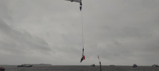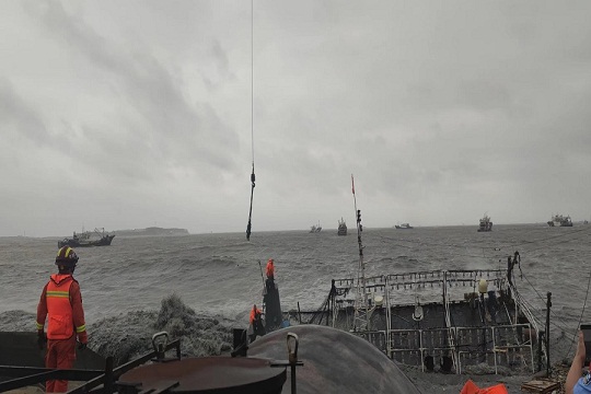 9月16日,山東威海海警局接到報(bào)警稱,一艘漁船在榮成市神飛造船廠附近海域發(fā)生船舶傾覆,兩名群眾被困,受臺(tái)風(fēng)“梅花”影響,事發(fā)海域風(fēng)力達(dá)7級(jí)以上,浪高3-5米,情況十分危急。海警執(zhí)法員第一時(shí)間趕赴現(xiàn)場(chǎng),并對(duì)接相關(guān)部門聯(lián)合行動(dòng)。海警執(zhí)法員不斷向被困群眾喊話安撫情緒,并采取吊車起吊的方式實(shí)施救援。經(jīng)過近一個(gè)小時(shí)的努力,兩名群眾安全脫困,目前身體狀況良好。