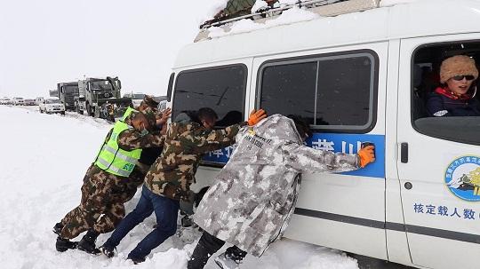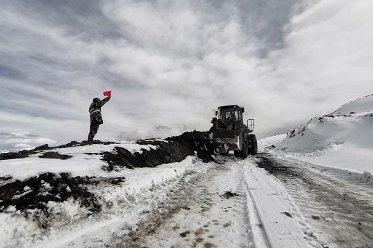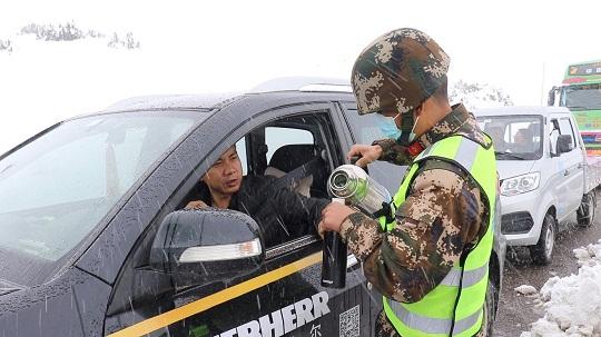 如果說夏秋兩季是和土石做斗爭,那冬春季就是和冰雪搶地盤。每年11月至次年4月,養(yǎng)護路段平均積雪深20厘米,暗冰也有10厘米厚。2021年4月,連夜降雪導致一臺電建部門的車輛陷入邊溝,亟待救援。中隊接到命令后,立即準備熱水、干糧、大衣等物資前往事發(fā)地,因天氣條件惡劣、施工道路狹窄,大型裝備無法展開,導致救援工作異常緩慢。官兵們在零下10攝氏度的低溫條件下,肩扛手刨,連續(xù)奮戰(zhàn)6個小時,硬是將失事車輛抬出邊溝。任務結(jié)束后,不少人凍得滿臉青紫,連話都說不出來。