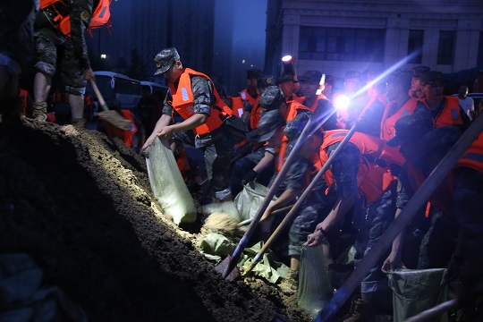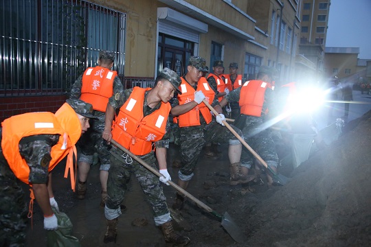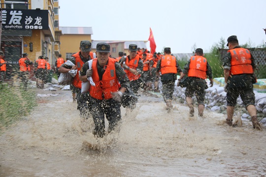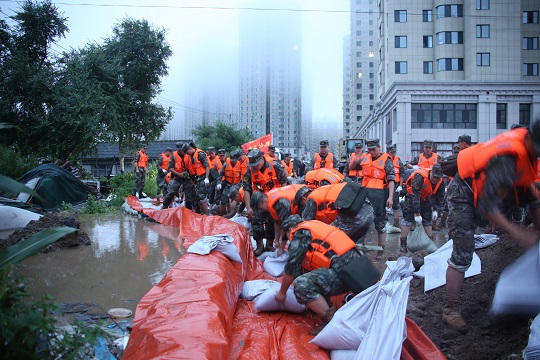 8月4日0時(shí)20分,武警黑龍江總隊(duì)哈爾濱支隊(duì)200余名官兵緊急馳援,連夜奮戰(zhàn)9小時(shí),在螞蟻河周邊壘筑沙袋2.8萬余個(gè),筑起1.3米高阻隔沙墻600余延長米,保證了當(dāng)?shù)厝嗣袢罕娚?cái)產(chǎn)安全。