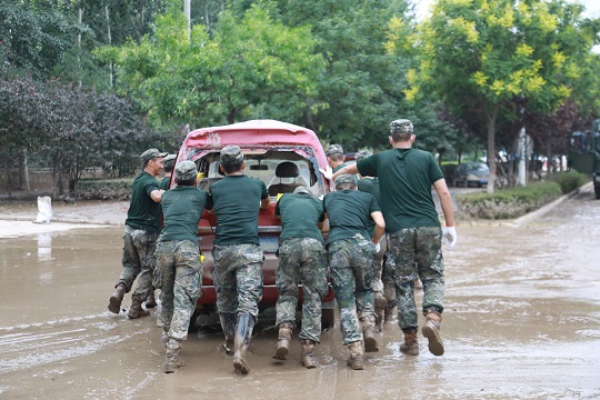 圖為武警河北總隊保定支隊官兵趕赴河北淶水受災現(xiàn)場。