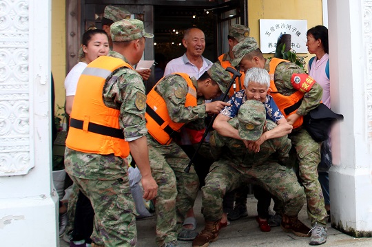 在該鎮(zhèn)敬老院,47名行動(dòng)不便的老人正在樓上“望水興嘆”。當(dāng)看見(jiàn)官兵來(lái)了,大家紛紛豎起大拇指。官兵背上老人,小心翼翼地蹚著齊膝深水一步步走出鎮(zhèn)子、走向安全地域。一位老大爺激動(dòng)地說(shuō):“解放軍好樣的,你們要是不來(lái),我們真不知道該怎么辦?!?/p>