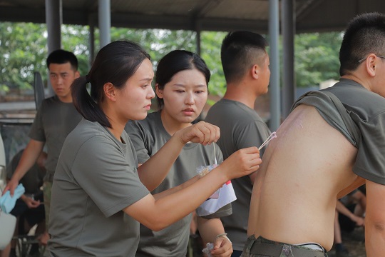 圖為陸軍第82集團軍“鐵軍旅”“模范衛(wèi)生隊”為官兵巡診擦藥。楊仕偉 攝