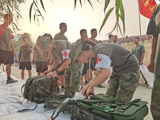 正午時分,天氣悶熱。連續(xù)奮戰(zhàn)近8個小時,“模范衛(wèi)生隊”特診技師、二級上士趙鑫的衣服干了又濕,臉頰和胳膊曬得通紅。除了擔負全旅的衛(wèi)勤保障任務,趙鑫和連隊其余9名女兵主動請戰(zhàn):挺在一線,裝沙筑堤?!澳斜芨傻奈覀兌寄芨伞!壁w鑫說。