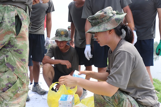 耿穎慧到達任務區(qū)后,第一時間投入工作??焖俅罱镁茸o所,歸納整理藥品,參加堤壩巡診……8月8日,迎戰(zhàn)洪峰前,她主動加入到堤壩加固任務中。裝沙、扎口、搬運、筑壩……哪里需要哪里就有她的身影。汗水打濕衣襟,鍬鎬磨出血泡。休息調(diào)整期間,參加過維和任務的耿穎慧來到受災群眾中,為大家巡診擦藥。