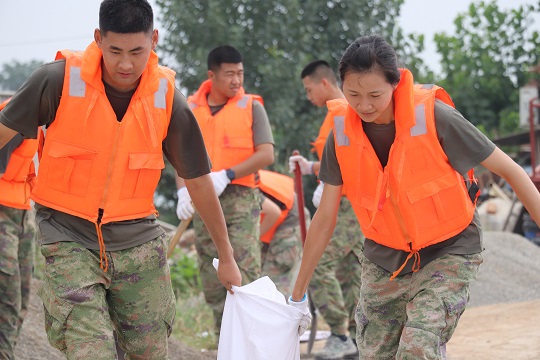 圖為陸軍第82集團軍“鐵軍旅”女兵在大清河天津靜海段裝填沙袋加固堤壩。楊仕偉 攝