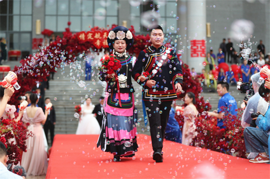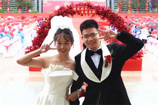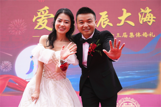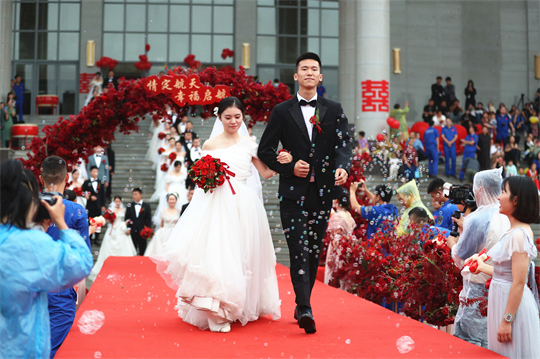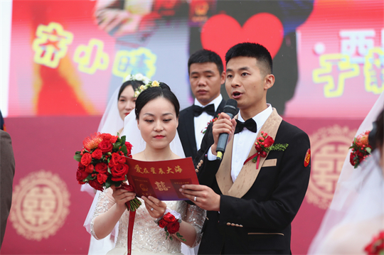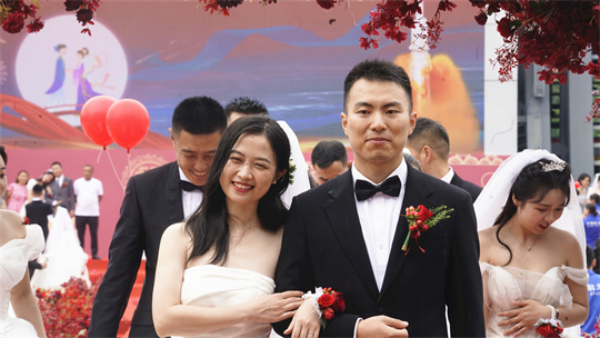 舞臺、氣球精心裝扮,美景、佳人喜迎幸?!槎Y現(xiàn)場,新郎們身著深色西裝,筆挺英?。恍履飩兩泶嵃谆榧?,美麗動人。一個個精心設(shè)置的儀式,一張張洋溢幸福的笑臉,讓這場集體婚禮甜蜜加倍、幸福爆表。