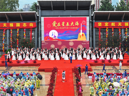 “星辰大海,夢想自有夢想的力量,仰望在銀河的想象,我們起航……”活動最后,全體新人與觀禮人員共同合唱《星辰大?!?。愛在星辰大海,新人們把愛的誓言唱響在航天大院,幸福的歌聲在青山之間久久回蕩……