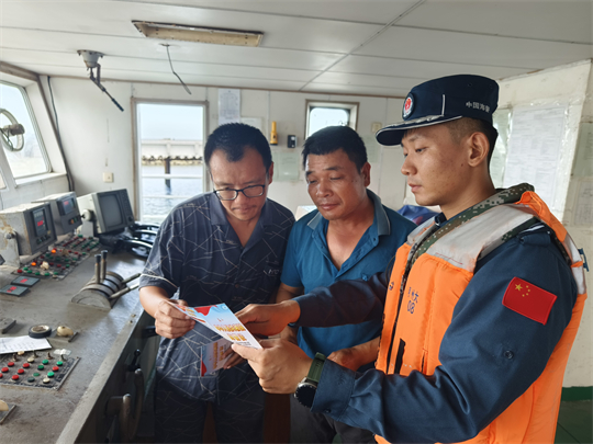 圖為海警執(zhí)法員開(kāi)展防臺(tái)防汛宣傳。