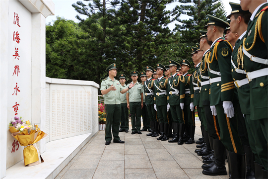 圖為武警海南總隊(duì)官兵在解放海南島戰(zhàn)役烈士陵園祭奠革命烈士時(shí),大隊(duì)教導(dǎo)員為官兵們講述革命先烈光輝事跡。