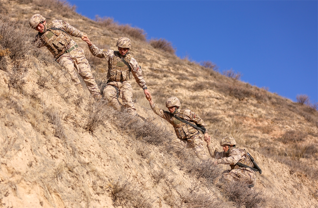 圖為官兵協(xié)作穿越復(fù)雜地形。