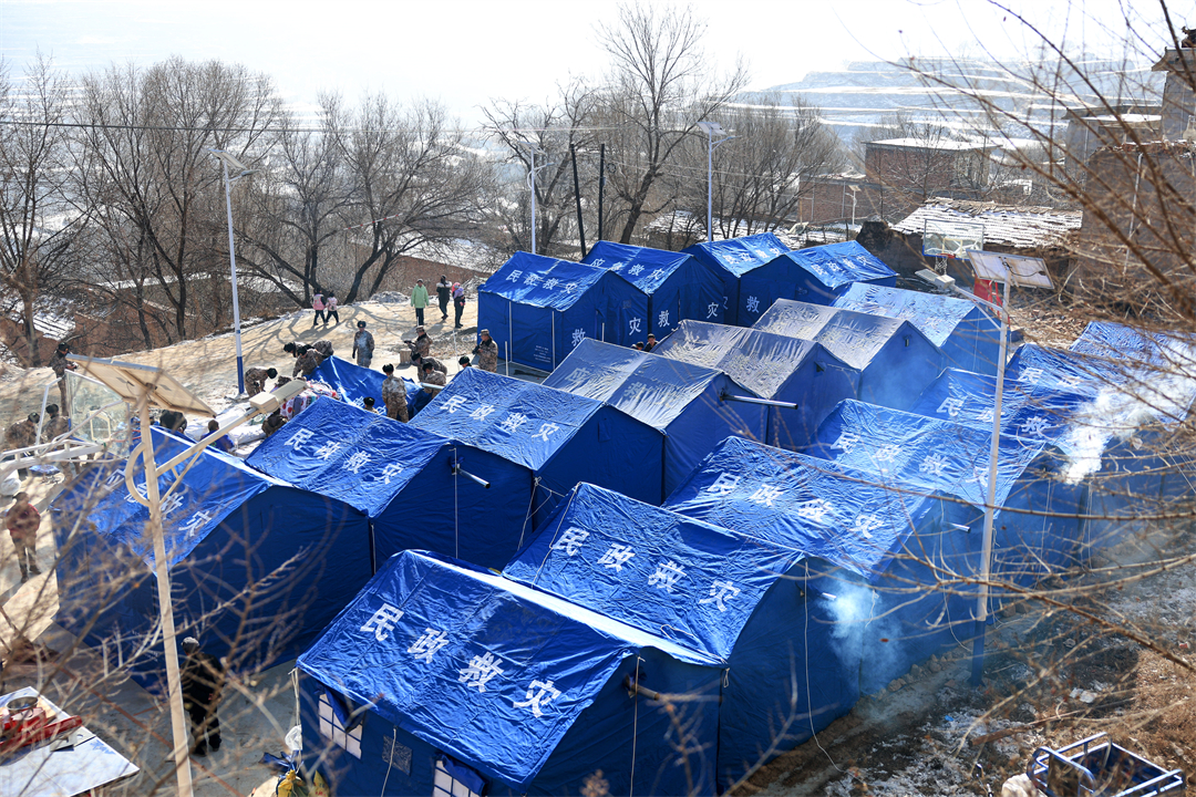 圖為12月21日,武警甘肅總隊臨夏支隊官兵在積石山縣劉集鄉(xiāng)陽屲村搭建的帳篷。