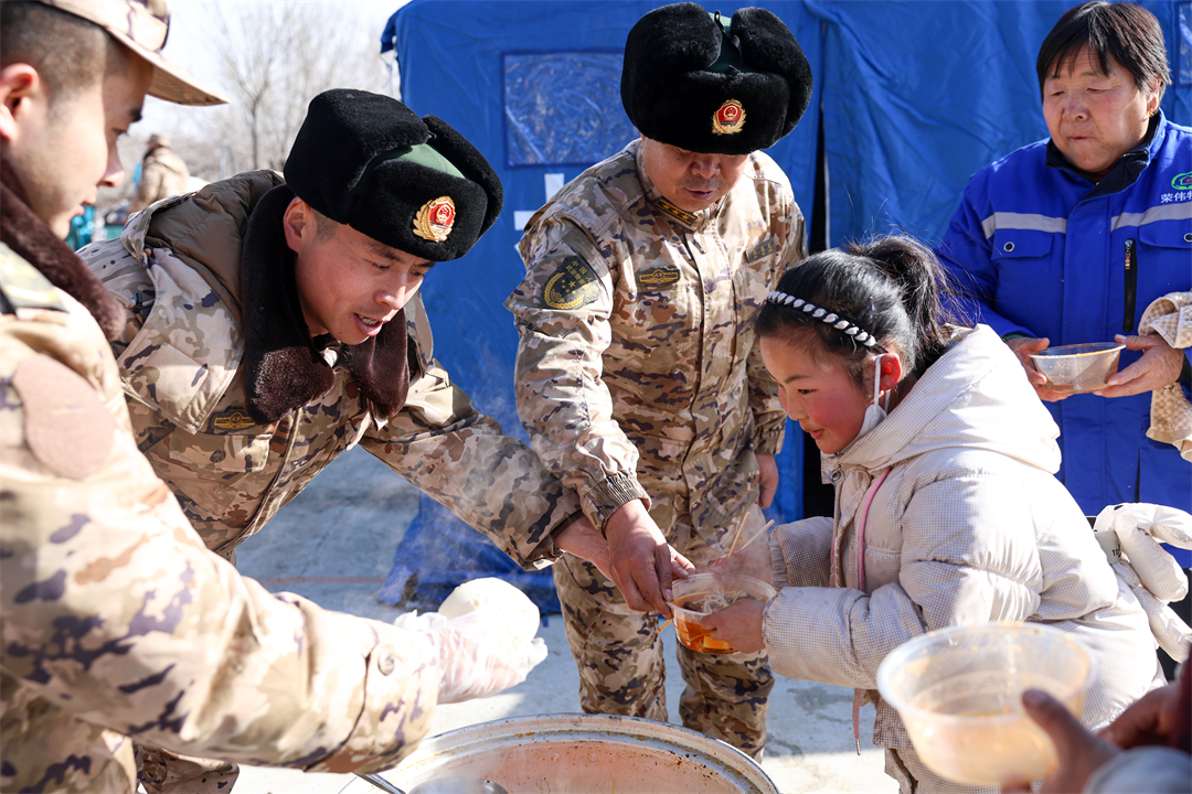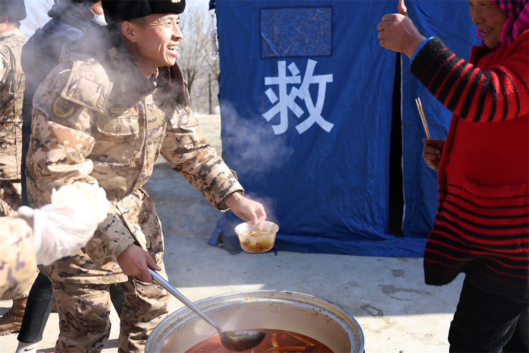 圖為12月21日,武警甘肅總隊臨夏支隊官兵在積石山縣劉集鄉(xiāng)陽屲村為受災(zāi)群眾供應(yīng)熱食。