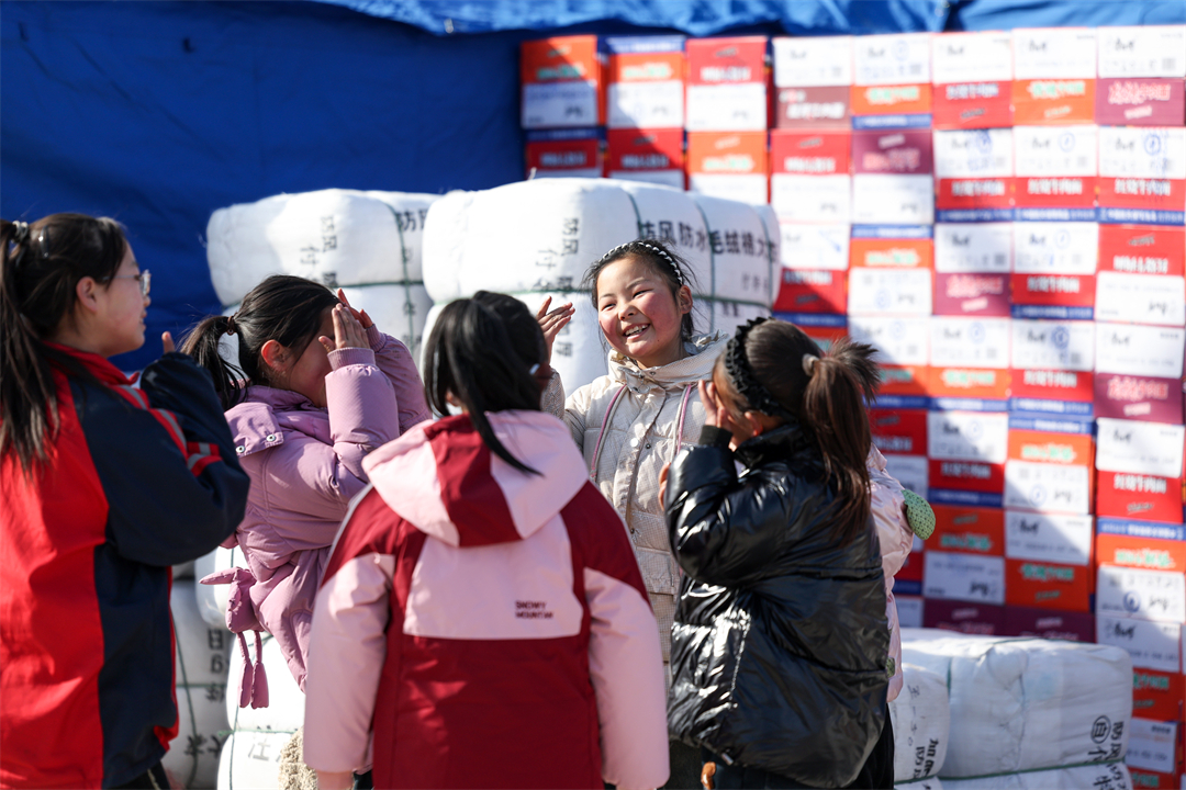 圖為12月21日,在甘肅省臨夏州積石山縣劉集鄉(xiāng)陽屲村安置點,小朋友們吃著武警甘肅總隊臨夏支隊官兵制作的熱食,臉上露出了幸福的笑容。