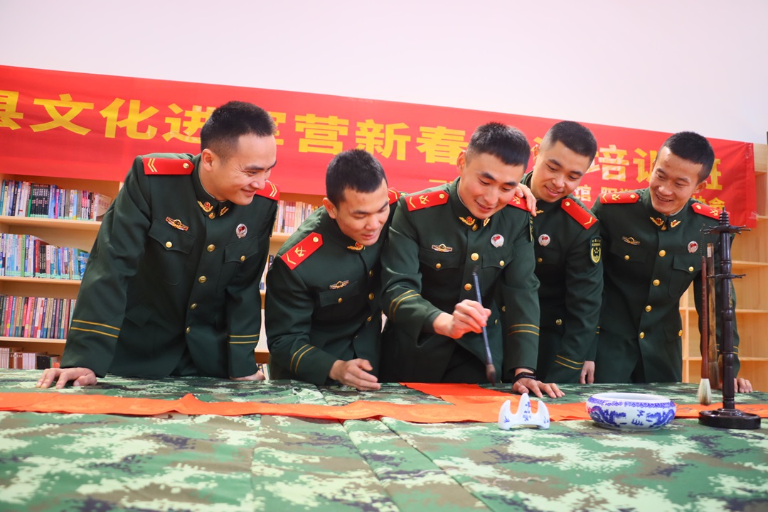 圖為春節(jié)期間,武警陽(yáng)朔中隊(duì)官兵組織寫(xiě)春聯(lián)。