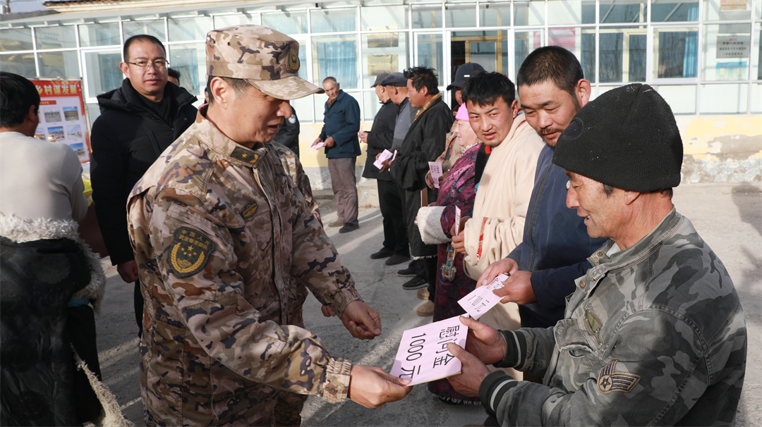 圖為武警官兵為村民送上慰問金。