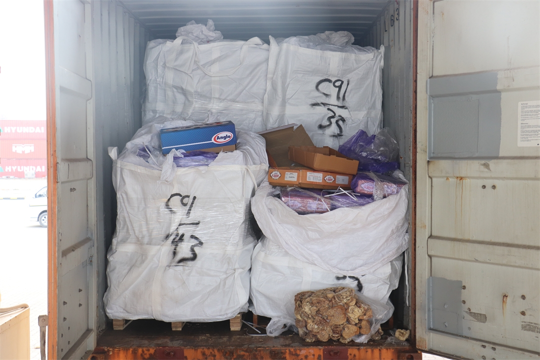 圖為集裝箱中存放大量豬肚。