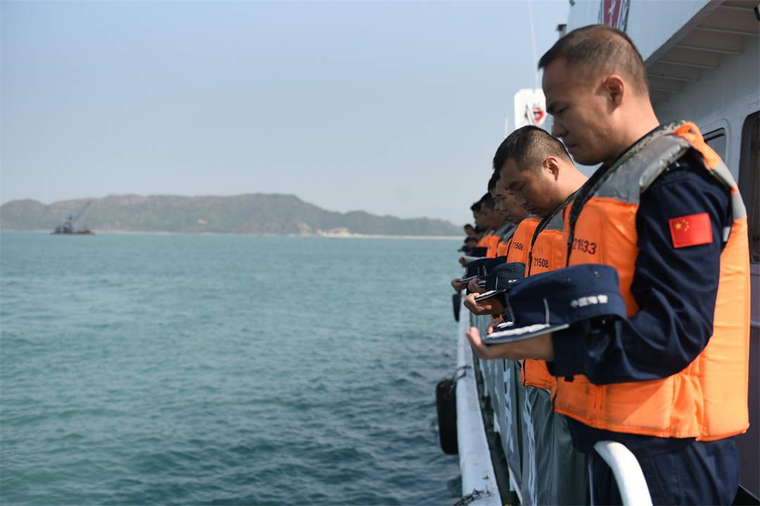 “全體都有!脫帽,默哀。”伴隨著現(xiàn)場(chǎng)指揮員下達(dá)口令,船艇汽笛長鳴、響徹海天,全體人員整齊列隊(duì)、脫帽肅立。
