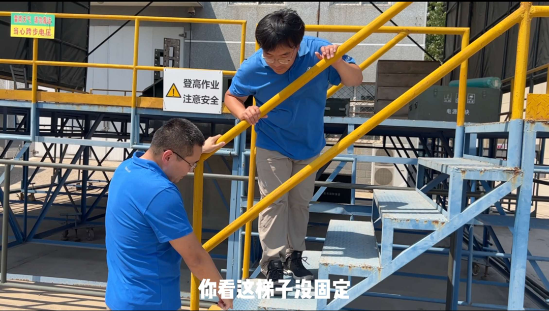 “這個(gè)梯子沒(méi)固定,上下平臺(tái)很容易摔倒?!币曨l中,小翟叫住正準(zhǔn)備登上平臺(tái)的小劉,并帶著他一起將四個(gè)輪子鎖緊。這是在調(diào)試平臺(tái)測(cè)試時(shí)容易被忽略的一處隱患,視頻通過(guò)糾錯(cuò)的方式,講解登高作業(yè)的操作規(guī)范,讓大家更容易入腦入心。