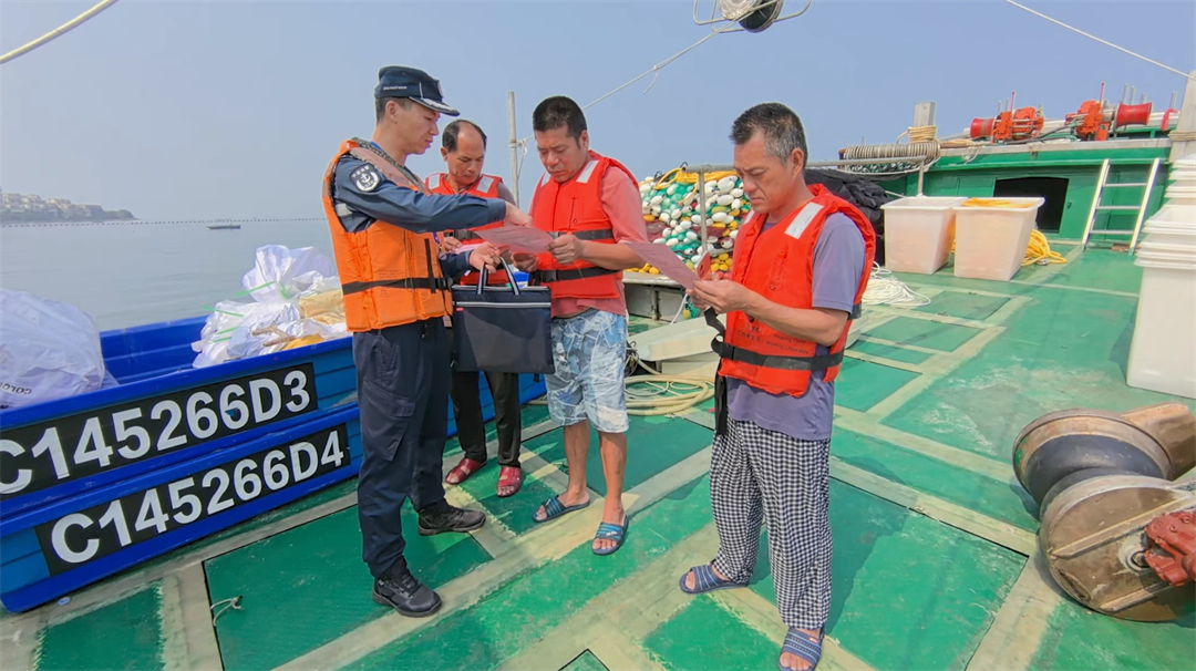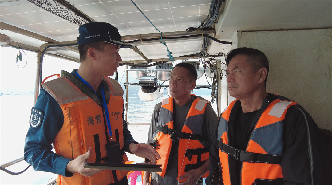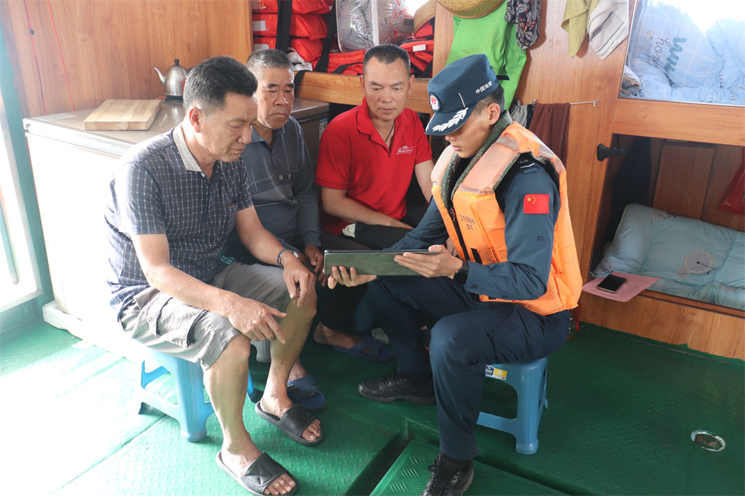 圖為執(zhí)法員向漁船民講解國家安全相關(guān)知識。