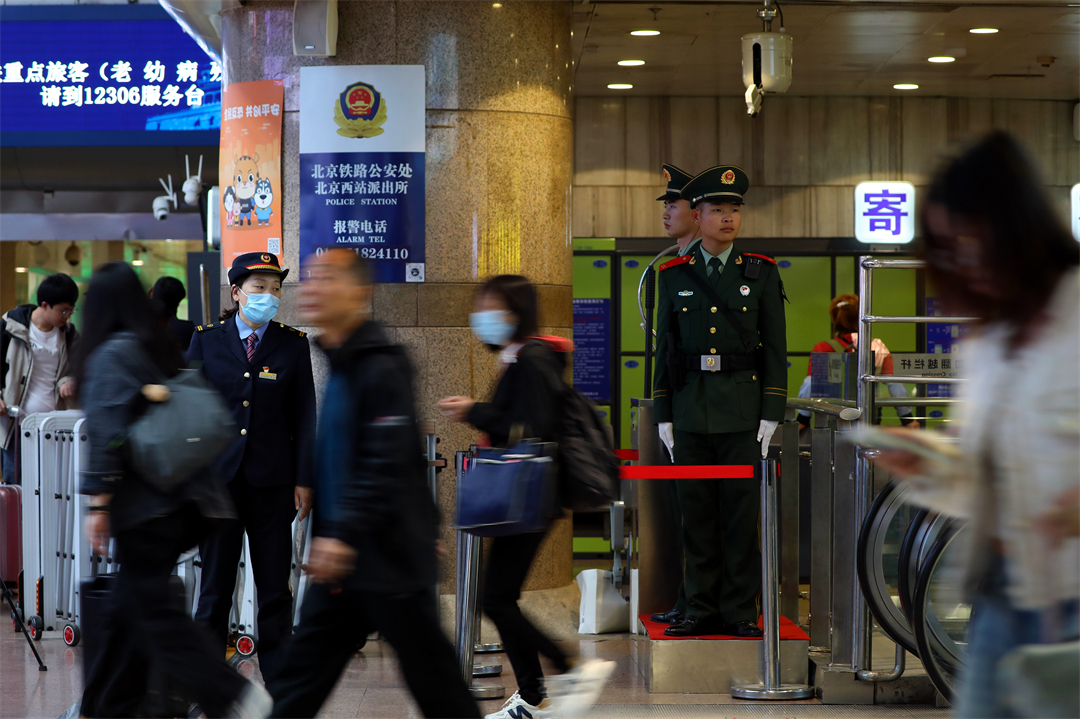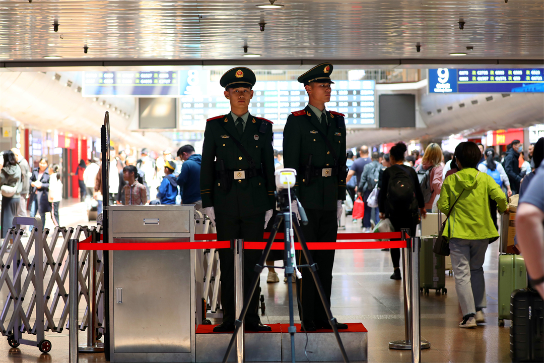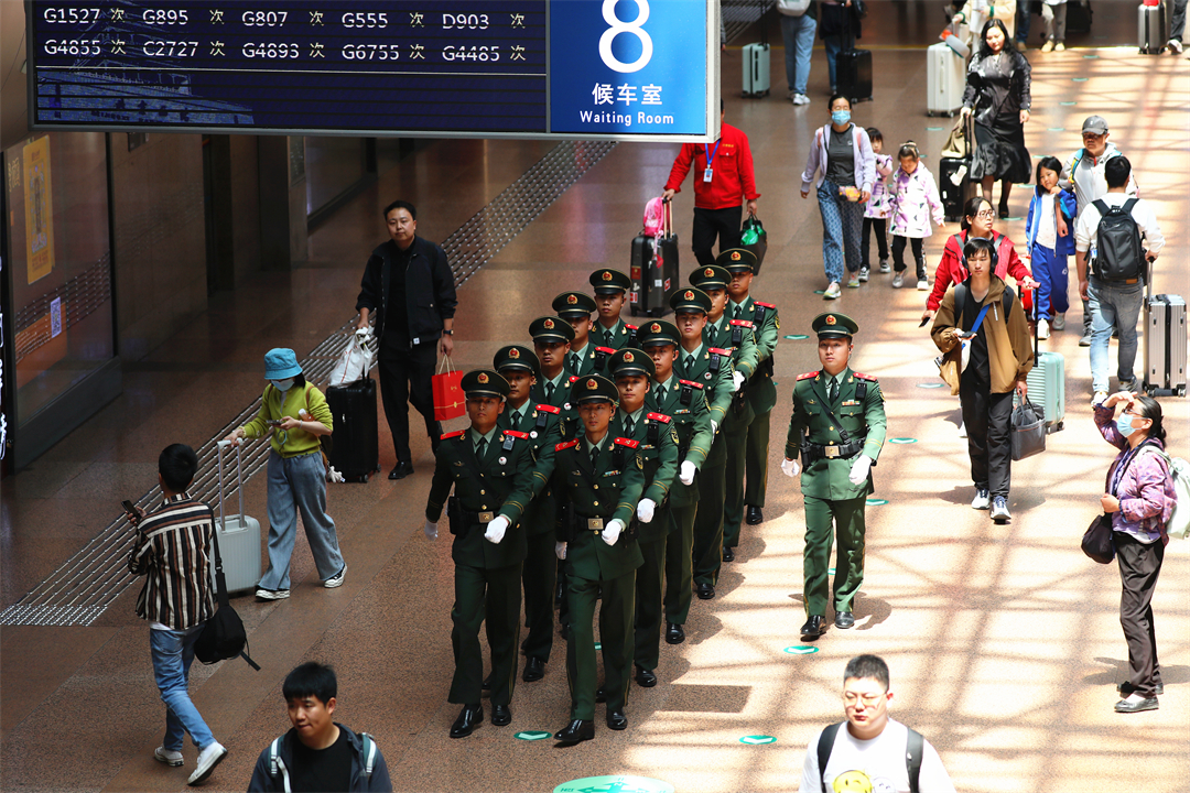 “五一”假期,北京地區(qū)迎來(lái)雙向出行高峰,北京西站旅客量明顯增多,擔(dān)負(fù)北京西站守衛(wèi)任務(wù)的武警北京總隊(duì)執(zhí)勤第六支隊(duì)官兵堅(jiān)守執(zhí)勤戰(zhàn)位,熱心提供幫助,守護(hù)旅客平安出行。