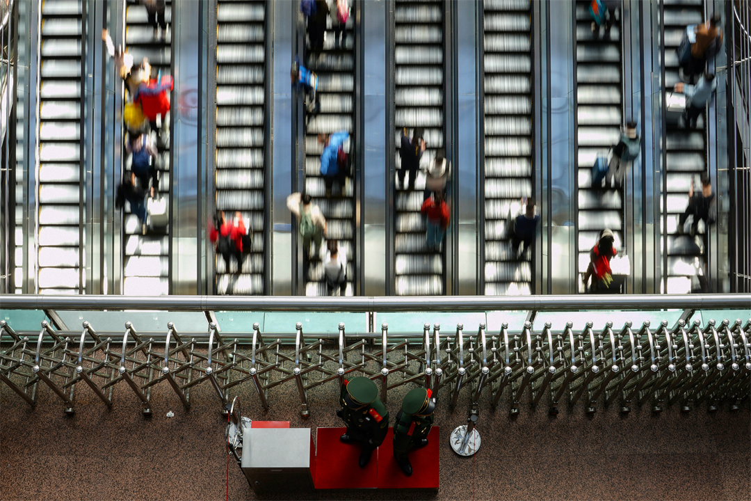 圖為兩名武警在進(jìn)站電梯旁執(zhí)勤。陳春越 攝