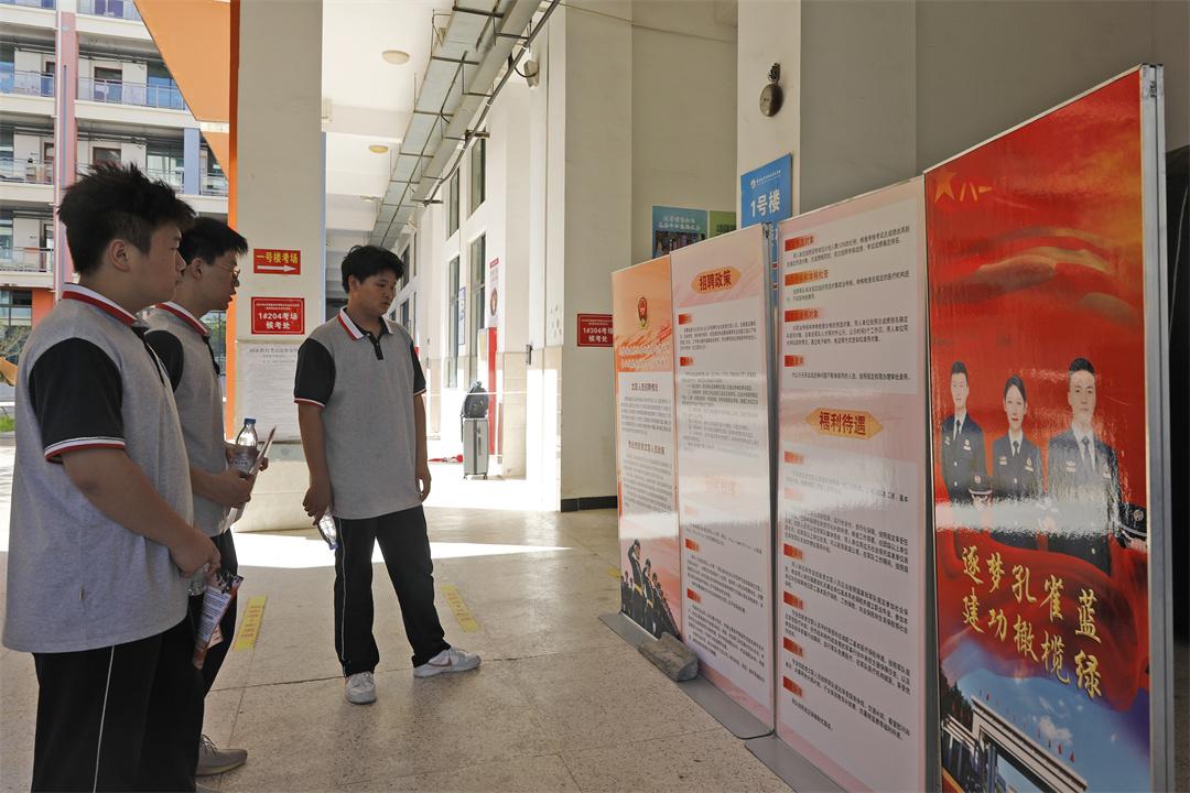 該校學生在與宣講員交流時說:“從小我就有一個迷彩夢,通過宣講了解了文職人員招考政策,期待能夠加入這支隊伍。接下來,我努力的目標就是穿上那身‘孔雀藍’?!?/p>