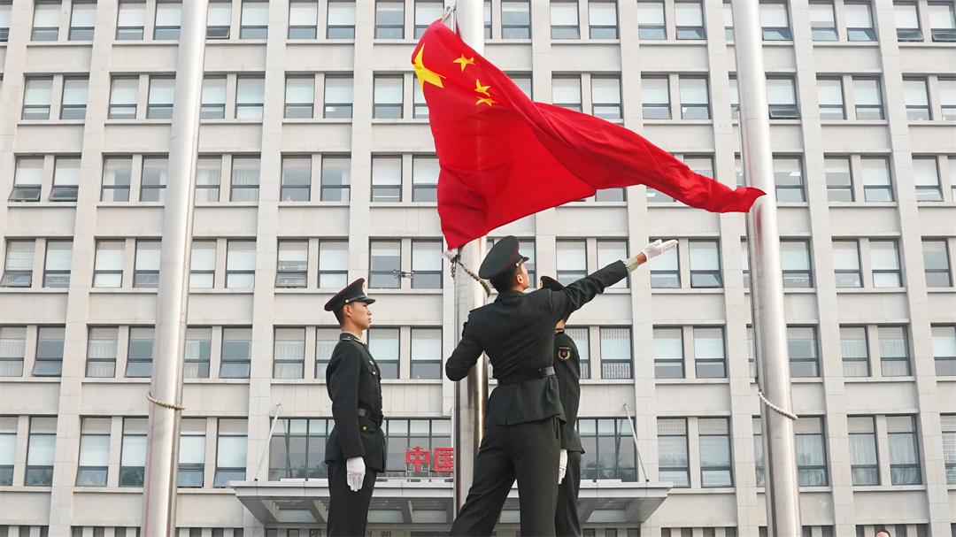 在雄壯激昂的《義勇軍進(jìn)行曲》中,五星紅旗冉冉升起,全體人員面向國旗莊嚴(yán)肅立,齊唱中華人民共和國國歌,在歌聲中對祖國深情告白,獻(xiàn)上對祖國最真摯的祝福。