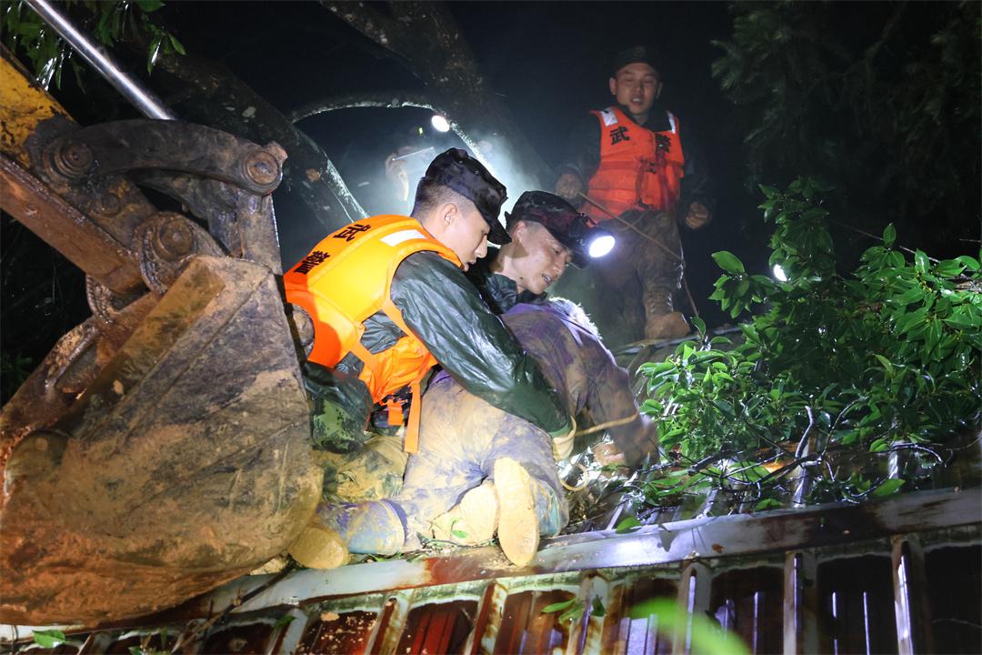 今年6月,受持續(xù)強(qiáng)降雨影響,上杭縣多地發(fā)生山體滑坡、內(nèi)澇等災(zāi)情。上杭中隊(duì)接到當(dāng)?shù)卣仍?qǐng)求后,中隊(duì)長(zhǎng)周徐聰立即帶領(lǐng)11名官兵挺進(jìn)受災(zāi)嚴(yán)重的上杭縣中都鎮(zhèn)。得知一處倒塌房屋內(nèi)埋著兩名老人,指揮員在確定老人位置后,迅速判定情況,指揮救援。