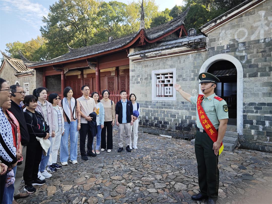 九月的福建省龍巖市上杭縣古田鎮(zhèn)山巒含黛,層林盡染,“古田會(huì)議永放光芒”8個(gè)大字熠熠生輝。循著聲音看去,一群游客正圍著一名身穿橄欖綠的帥氣小伙——武警福建總隊(duì)龍巖支隊(duì)上杭中隊(duì)“古田小火炬”講解員正在給游客進(jìn)行義務(wù)講解。